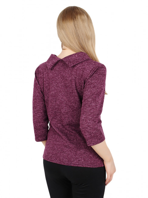 Элегантная женская блузка для повседневного гардероба. Цвет – сиреневый с мелкими светлыми разводами по всему изделию. Крой прямой, до середины бедра. Рукава – ¾, прямые, свободные. Горловина – невысокий хомут, открывающий шею. Чуть ниже – небольшой V-образный вырез и 4 декоративные складки.