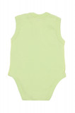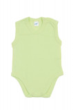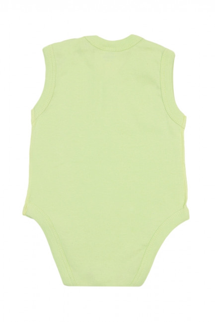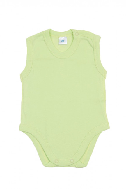 Легкое детское однотонное боди без рукавов. Прямой крой, овальный вырез горловины с застежкой на плече. Внизу между ножек также есть две кнопки-застежки, которые упрощают процесс одевания малыша. Материал – качественный 100% хлопок. Цвет – салатовый, неяркий. Горловина, проймы и линия ножек отделаны мягкой широкой бейкой в тон изделию. Рисунки и надписи на боди отсутствуют.