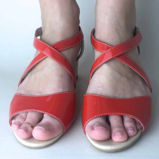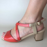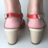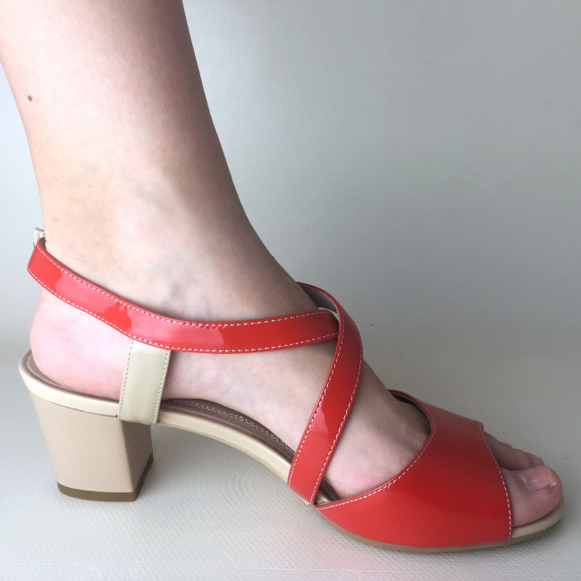 Летние женские босоножки, модель из лакированной натуральной кожи с толстым и устойчивым каблуком. В области мыска обувь выполнена в яркой расцветке, плавно переходящей в бежевую. Стильный дизайн, модное решение для летнего сезона.