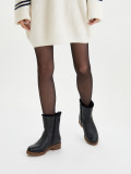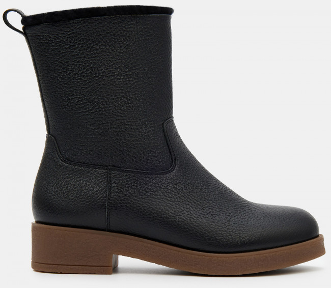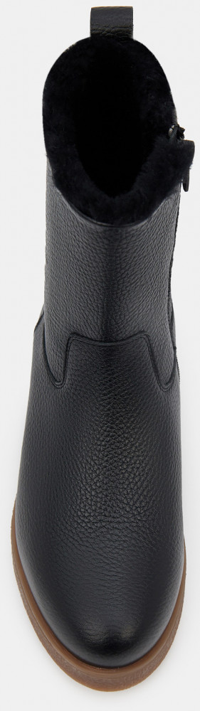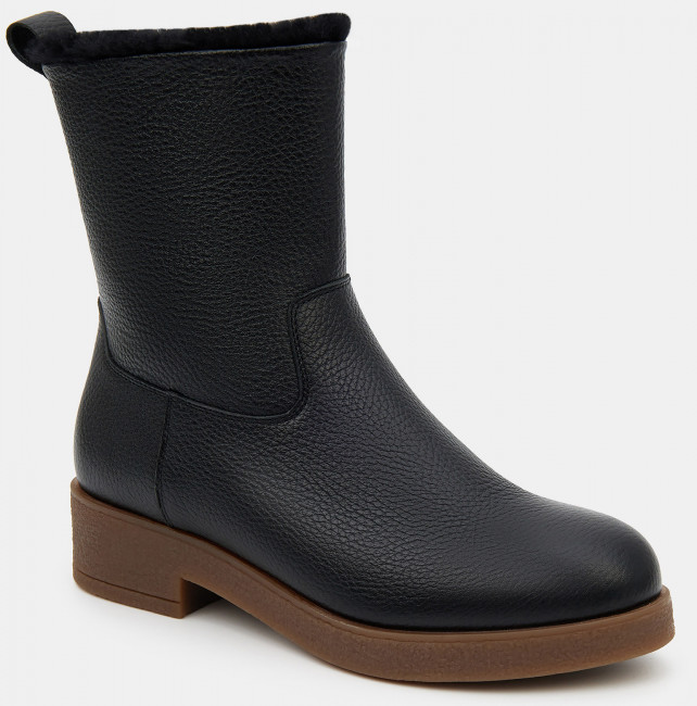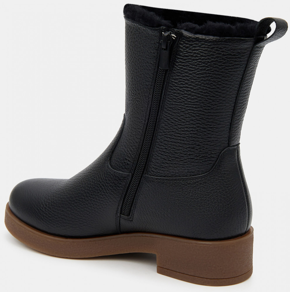 Зимние женские ботильоны черного цвета. Модель выполнена из качественной натуральной кожи. Подкладка и стелька утеплены натуральным мехом. Прочная контрастная ТЭП подошва отлично амортизирует и держит сцепление на скользких поверхностях. Ботильоны дополнят зимний базовый гардероб. Удобная модель под любой casual образ.