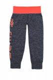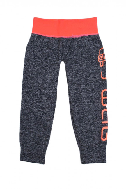 Спортивные леггинсы для девочек. Основной цвет-серый меланж, пояс на широкой резинке в оранжевом цвете. На правом бедре есть принт в виде надписи тоже оранжевого цвета. Облегающий фигуру крой. Состав-85% Хлопок 15% Эластан.