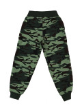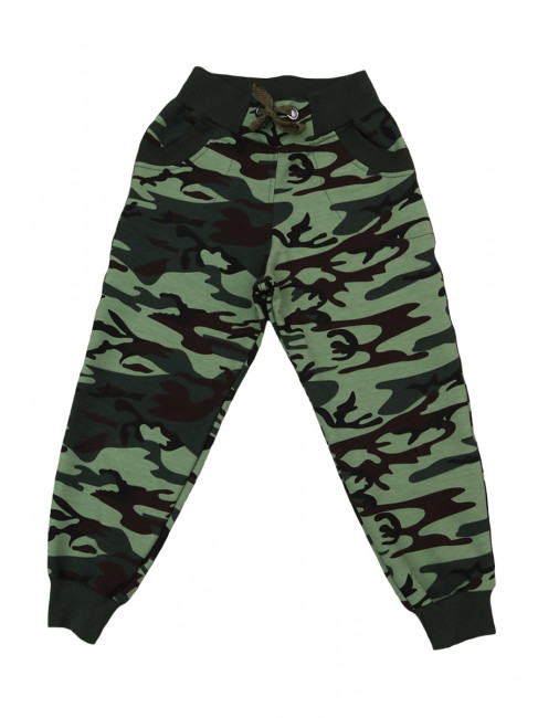 Стильные, спортивные брюки для мальчика с карманами, на манжетах. Пояс на резинке с завязками. Цвет-зелёный камуфляж. Материал-футер. Отличный вариант не только для занятия спортом, но и для прогулок в тёплую погоду.