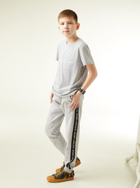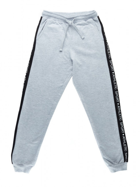 Брюки спортивные на манжетах. Пояс на резинке с завязками. Цвет-серый меланж, декорированы тесьмой. Тип ткани-Футер 2-х нитка.