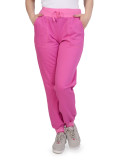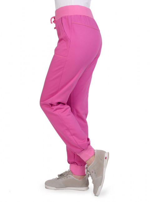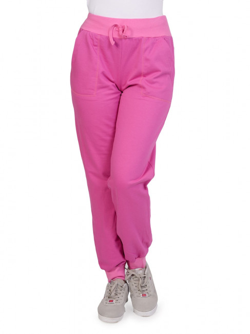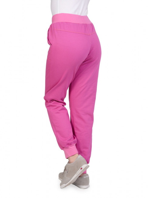 Спортивные брюки светло-сиреневого цвета с розовыми манжетами внизу. Посадка высокая. Пояс эластичный, розовый, на кулиске в тон поясу. По бокам два внутренних кармана, прошитых по контуру розовой ниткой. Материал – качественный хлопок, приятный на ощупь. Брюки не сковывают движения и отлично подходят как для занятий спортом, так и для отдыха. Ежедневный вариант на все сезоны с температурой воздуха выше нуля. Сочетаются практически с любой спортивной одеждой и обувью.
