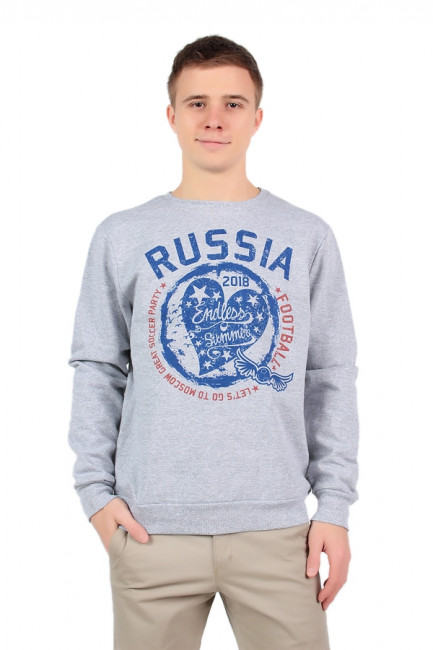 Мужской свитшот из двухниточного футера (100% хлопок). Крой у изделия прямой, основа свитшота и длинные рукава традиционно заканчиваются манжетами средней ширины. Вырез горловины округлый, неглубокий. Цвет – серый меланж. На груди есть большой рисунок: изображение синего сердца со звездами, синего мячика с крыльями, а также надписи «RUSSIA» и «2018» синего цвета, «FOOTBALL» и «Let’s go to Moscow great soccer party» красного цвета.