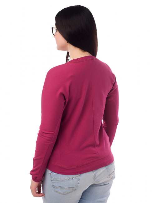 Женский свитшот классического кроя: приталенный силуэт, длинные, облегающие руку рукава с манжетами, круглый вырез горловины. Цвет – бордовый. Материал – 2-хниточный футер с небольшим добавлением лайкры. Без рисунков и надписей. Оригинальная и в то же время удобная вещь для повседневного гардероба. Легко стирается, хорошо сидит по фигуре. Комбинируется практически со всеми вещами, кроме строгих классических нарядов.