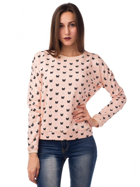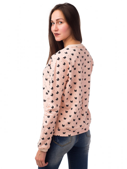 Легкий женский свитшот модного персикового цвета. Приталенный крой, длинный, слегка зауженный книзу рукав, округлый вырез горловины. Низ рукавов и горловина отделаны узкой, в меру свободой резинкой в тон изделию. По всему свитшоту есть мелкий рисунок – котики черного цвета. Материал – 2-хниточный футер с небольшим добавлением лайкры. Благодаря такому составу ткани этот свитшот очень приятен к телу, беспроблемный в уходе и отлично садится по фигуре. Прекрасный вариант для повседневного гардероба. Хорошо сочетается с джинсами, а также вещами спортивного и полуспортивного стиля.
