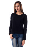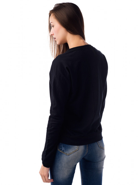 Женский свитшот классического кроя: приталенный силуэт, длинные, облегающие руку рукава с манжетами, круглый вырез горловины. Цвет – черный. Материал – 2-хниточный футер с небольшим добавлением лайкры. Без рисунков и надписей. Оригинальная и в то же время удобная вещь для повседневного гардероба. Легко стирается, хорошо сидит по фигуре. Комбинируется практически со всеми вещами, кроме строгих классических нарядов.