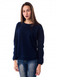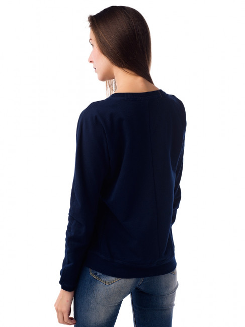 Женский свитшот классического кроя: приталенный силуэт, длинные, облегающие руку рукава с манжетами, круглый вырез горловины. Цвет – тёмно-синий. Материал – 2-хниточный футер с небольшим добавлением лайкры. Без рисунков и надписей. Оригинальная и в то же время удобная вещь для повседневного гардероба. Легко стирается, хорошо сидит по фигуре. Комбинируется практически со всеми вещами, кроме строгих классических нарядов.