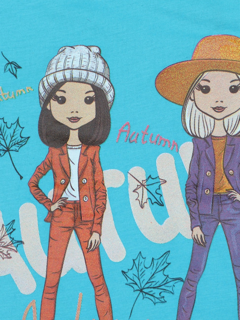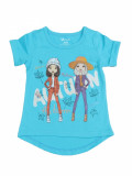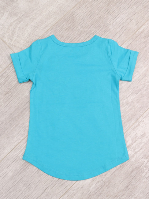 Стильная летняя футболка для девочки. Вырез горловины округлый неглубокий. Сзади изделие немного удлиненно. Цвет- синий с принтом. Материал-100% качественный хлопок без добаления синтетических нитей.