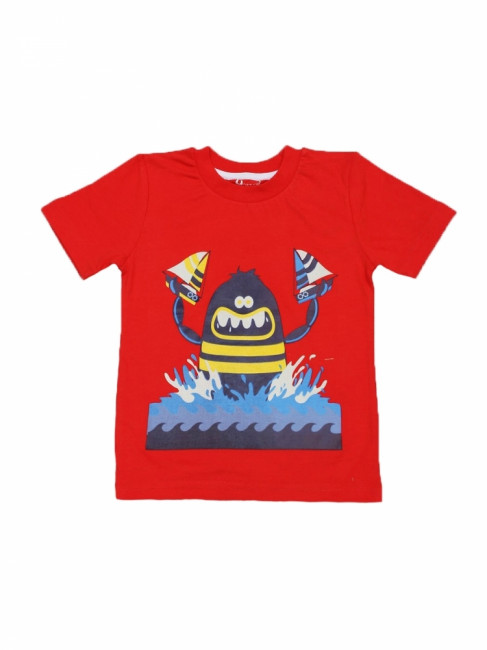 Стильная, летняя футболка для мальчика. Вырез горловины округлый, неглубокий. Крой прямой. Цвет изделия- красный с крупным принтом. Материал-100% качественный хлопок без добавления синтетических нитей.