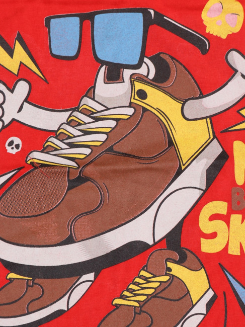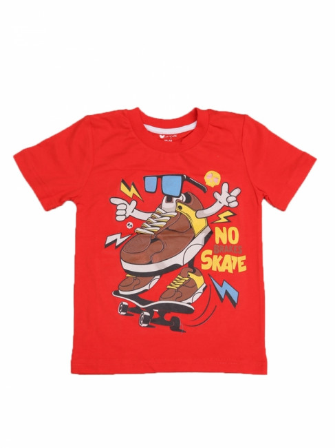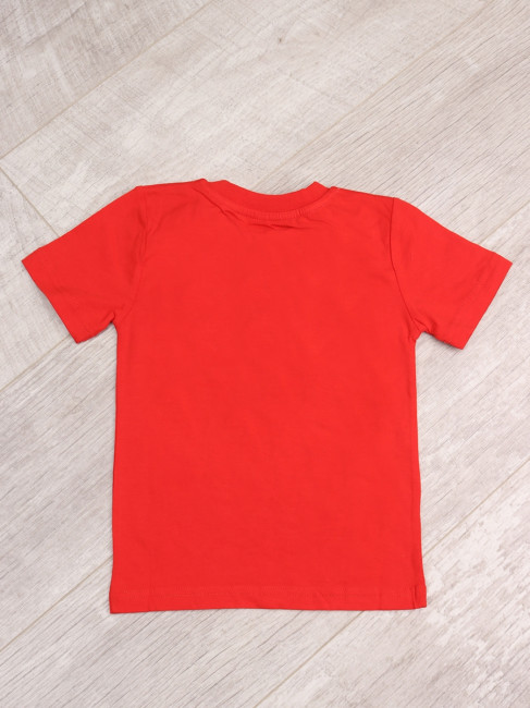 Стильная летняя футболка для мальчика. Вырез горловины округлый неглубокий. Крой прямой.  Цвет изделия- красный с принтом. Материал-100% качественный хлопок без добаления синтетических нитей.