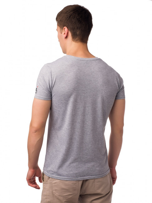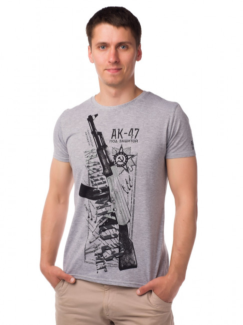Стильная мужская футболка, слегка приталенного кроя. Длина – средняя, цвет – серый-меланж, материал – 100%-й качественный хлопок. Короткий зауженный рукав, круглый неглубокий вырез горловины. На груди футболка украшена оригинальным принтом с изображением легендарного автомата Калашникова. Такая футболка относится к базовым вещам ежедневного мужского гардероба и отлично сочетается практически с любой одеждой.