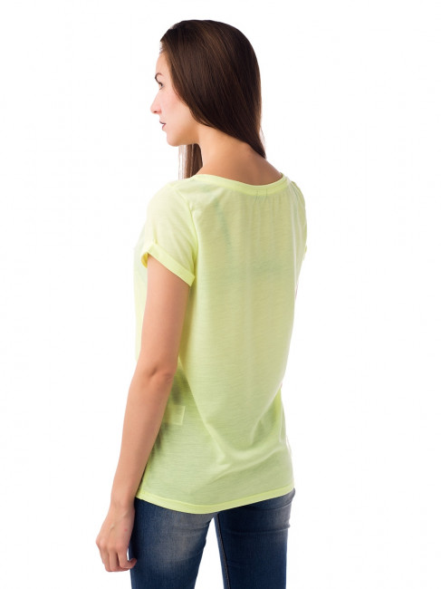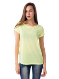 Свободная футболка для девушек, любящих удобные и яркие вещи. Прямой крой, короткий прямой рукав с модным отворотом, широкий вырез горловины, отделанный бейкой в цвет изделию. Длина – до середины бедра. Цвет – желтый. Материал – 100% полиэстер. Футболка отлично сочетается с джинсами, шортами и вещами спортивного стиля. Недорогой повседневный вариант. Легко стирается, не требует специального ухода.
