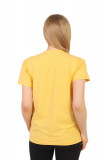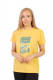 Стильная женская футболка, прямого кроя. Большемерка на размер. Цвет-горчичный. На изделии присутствует принт. Вырез горловины округлый неглубокий. Состав-80% Хлопка 20% Вискозы.