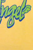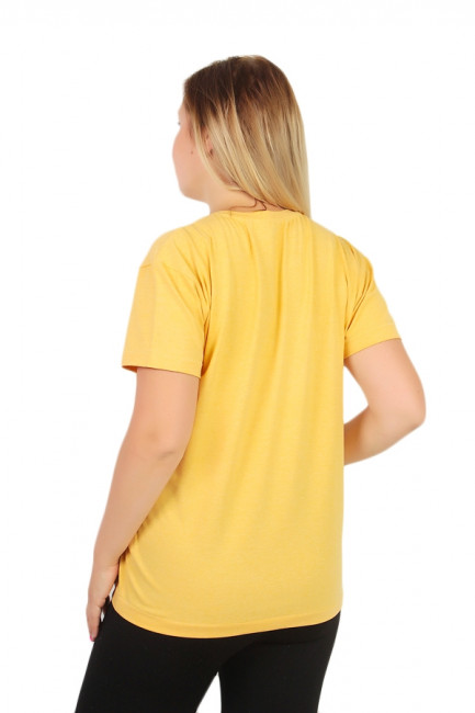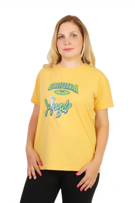 Стильная женская футболка, прямого кроя. Большемерка на размер. Цвет-горчичный. На изделии присутствует принт. Вырез горловины округлый неглубокий. Состав-80% Хлопка 20% Вискозы.