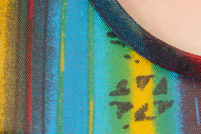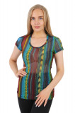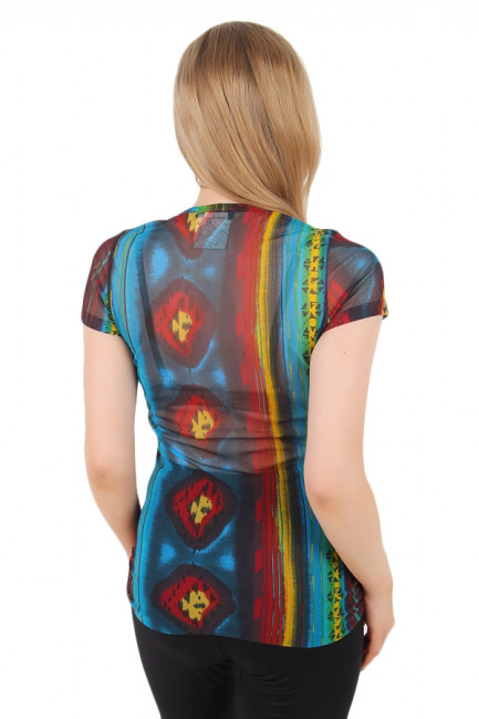 Футболка женская полупрозрачная. Цвет-красный/синий с абстрактным принтом. Длина посередину бедра. Вырез горловины, округлый, неглубокий.