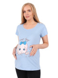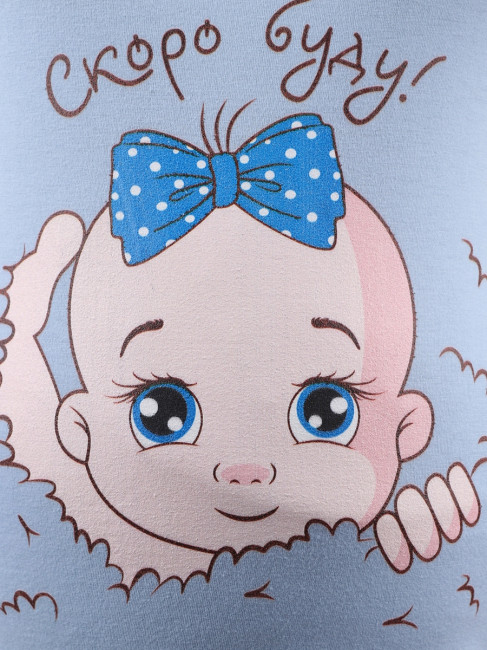 Футболка для беременных – мягко облегающая фигуру сверху и расклешенная внизу. Рукава короткие, прямые. Вырез горловины овальный, средней глубины. Длина – до середины бедра. Цвет – голубой. В области живота есть принт в видемладенца и надпись"Скоро буду" . Материал изделия – 100% хлопок, приятный для чувствительной кожи будущей мамы.