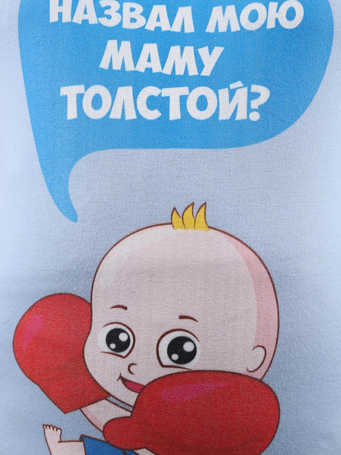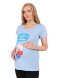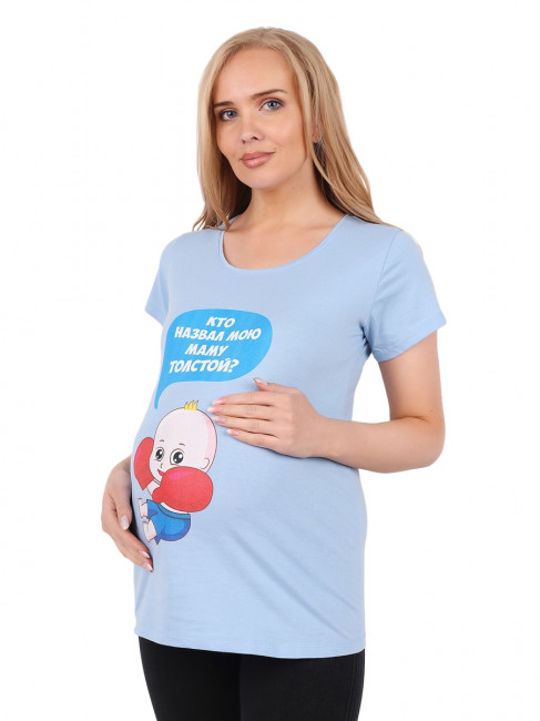 Футболка для беременных – мягко облегающая фигуру сверху и расклешенная внизу. Рукава короткие, прямые. Вырез горловины овальный, средней глубины. Длина – до середины бедра. Цвет – голубой. В области живота есть принт в виде младенца с боксёрскими перчатками . Материал изделия – 100% хлопок, приятный для чувствительной кожи будущей мамы.