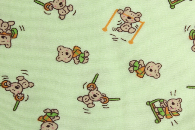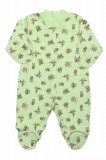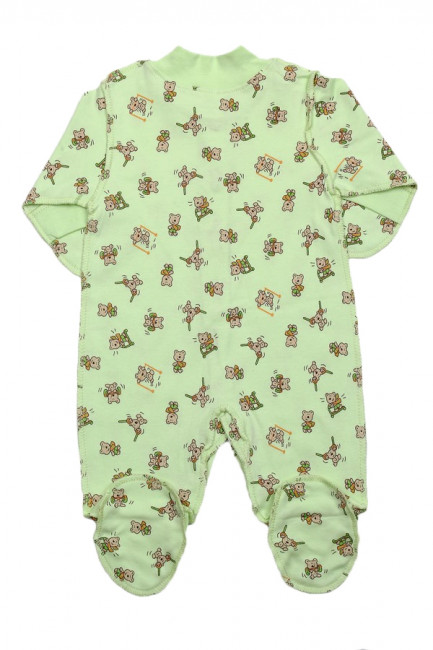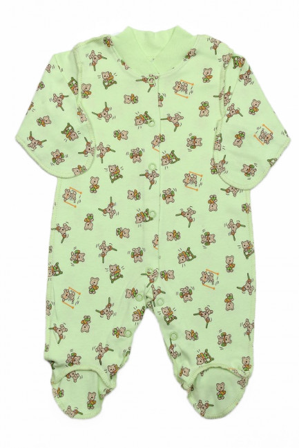 Легкий детский комбинезон для самых маленьких. Изготовлен из 100% хлопка, мягкий, приятный к телу. Все швы наружные. Крой свободный, ладошки и пятки закрыты, спереди по всей длине комбинезона есть кнопки, которые позволяют одевать малыша быстро и без лишних усилий. Цвет – салатовый. Воротник, кнопки и швы - салатовые, в тон изделия. По всему комбинезону есть мелкий принт с мишками. Подходит для любого сезона и любого случая.
