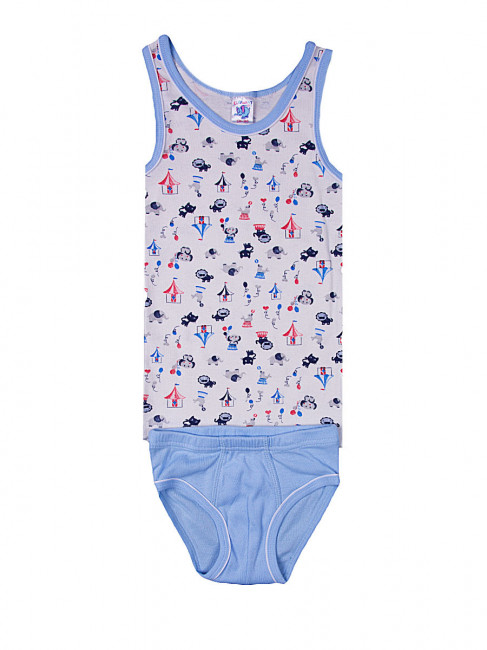 Комфортный комплект для мальчика, состоящий из трусиков и майки. Майка: классический крой, глубокий округлый вырез горловины. Цвет – белый, горловина и проймы отделаны голубой бейкой. Майка украшена принтом – с изображением цирковых зверюшек (по всему изделию). Трусики: слипы классического кроя, на резинке, со средней посадкой. Цвет – голубой, без рисунков и надписей. Декоративный элемент – тонкая белая полоска вокруг линии ног. Материал комплекта – хлопок без примеси синтетических нитей.