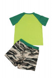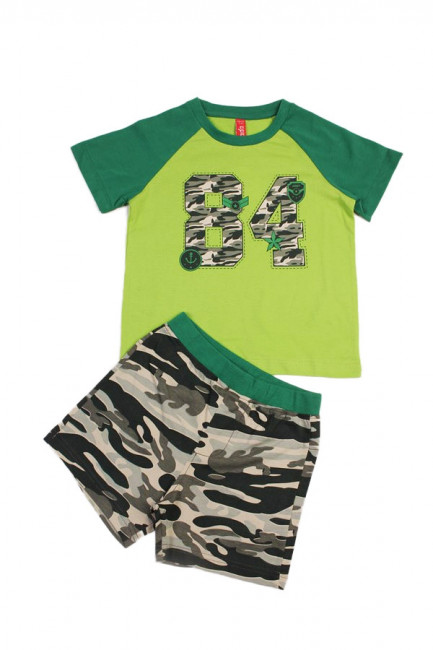 Комплект из натурального хлопка для мальчика. В составе комплекта- футболка и шорты. Футболка ярко салатового цвета с зелеными горловиной и рукавами.Отделана принтом в виде цифр расцветки комуфляж. Шорты оформлены в цвете комуфляж с зеленой окантовкой на поясе.Отличный, комфортный комплект на жаркую погоду и для повседневной носки.
