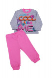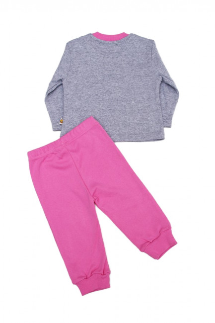 Комплект для девочки, состоящий из джемпера прямого кроя и свободных брюк. Джемпер: длина – до середины бедра, округлый вырез горловины. Цвет комплекта- комбинированный серый/розовый. Спереди принт в виде разноцветных надписей. Брюки на резинке, штанины на манжетах, однотонные без принта. Материал – хлопок без примеси синтетики.