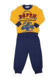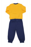 Комплект для мальчика, состоящий из лонгслива прямого кроя и свободных брюк. Логнслив: длина – до середины бедра, округлый вырез горловины. Цвет комплекта- комбинированный жёлтый/тёмно-синий. Спереди принт в виде разноцветных надписей и авто. Брюки на резинке, штанины на манжетах, однотонные без принта. Материал – хлопок без примеси синтетики.