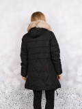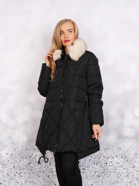 Тёплая, стильная женская куртка/пальто с карманами . Рукава длинные. Цвет- чёрный. Застёжка- молния.Выполнено изделие в форме трапеции. Так же на изделии присутствует капюшон с отстёгивающимся мехом бежевого цвета. Утеплитель-синтепон.