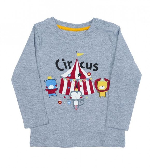 Оригинальный лонгслив для маленьких модников и модниц. Прямой крой, длинные рукава без манжетов, округлый вырез горловины. На левом плече есть застежка на двух кнопках, которая облегчает процесс надевания лонгслива. Цвет изделия – серый меланж, на груди изделие украшено рисунком с изображением цирка шапито и весёлых зверушек циркачей. Материал – 100% хлопок. Такой лонгслив можно носить с любыми спортивными и полуспортивными вещами. Ваш ребенок не останется незамеченным.
