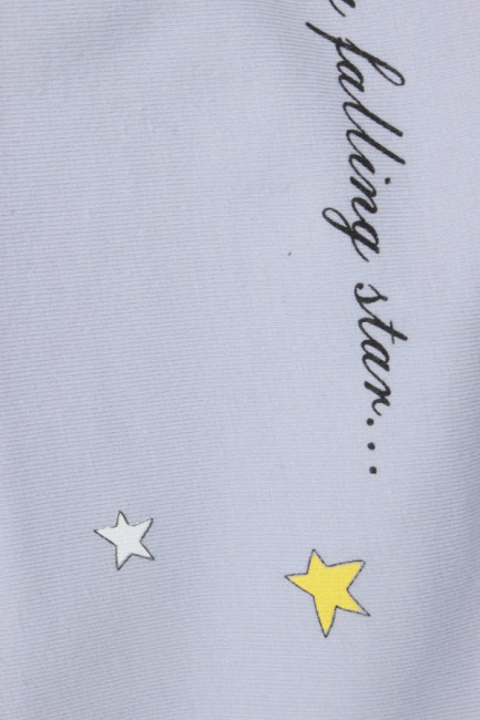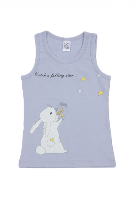 Повседневная майка для девочки – идеальна для дома, детского сада или в качестве элемента летней пижамы. У изделия прямой крой, в меру широкие проймы, округлый вырез горловины средней глубины. Материл – хлопок, синтетика в составе ткани отсутствует. Цвет – сиреневый. Спереди есть большой рисунок: белый кролик, пытающийся поймать в банку падающие звезды, и изящная надпись «Catch a falling star…».
