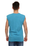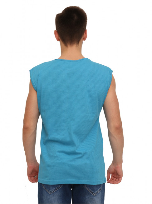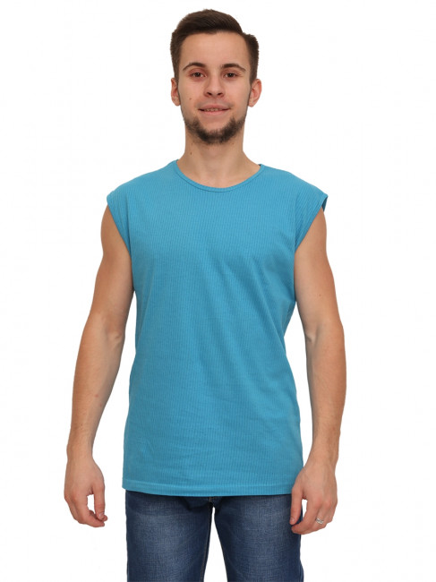 Мужская майка прямого кроя. Округлый, неглубокий вырез горловины, небольшая пройма. Ткань - рибана, качественный 100% хлопок, приятный к телу. Цвет - бирюзовый, однотонный, без рисунков и надписей. Неотъемлемая деталь базового мужского гардероба, простой и удобный вариант на каждый день.