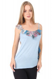 Легкий женский топ с оригинальной отделкой. Цвет: голубой. Крой приталенный, длина – до бедра, бретели тонкие. Правая бретель, линия декольте и левый бок украшены нежным воланом из воздушной ткани с абстрактным принтом, сочетающимся с основным цветом изделия.