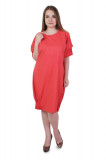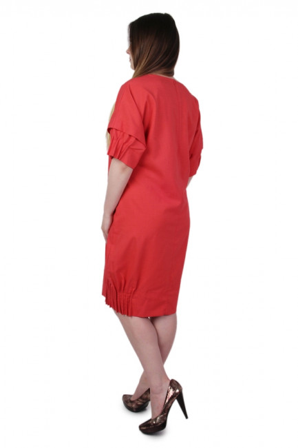 Платье-формы колокльчик. Вырез горловины округлый, неглубокий. Рукава короткие, со стяжкой по бокам, подрл платье также декорирован стяжкой по бокам. Цвет-розовый, однотонный. Длина до колен.