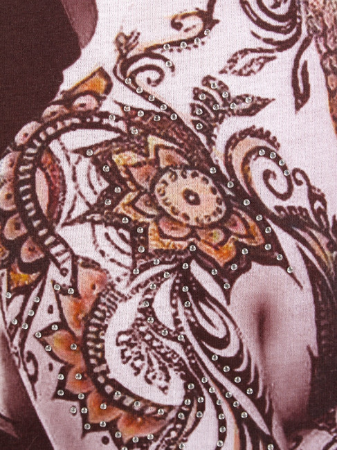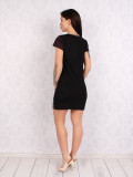Стильная женская модель. Вырез горловины округлый, неглубокий. Крой слегка приталенный. Цвет-чёрный с принтом. Рукава-короткие. Материал-Вискозный трикотаж.