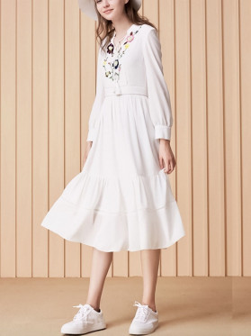 Короткие рукава и универсальная длина делают это платье идеальным выбором для теплого времени года, позволяя оставаться стильной и свободной. Отложной воротник и пояс добавляет элегантности, а универсальный фасон позволяет платью подойти под любой тип фигуры.
