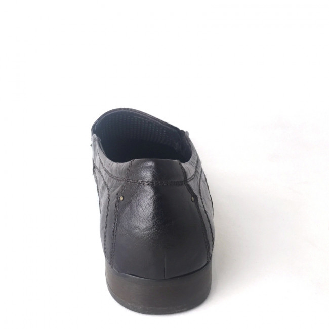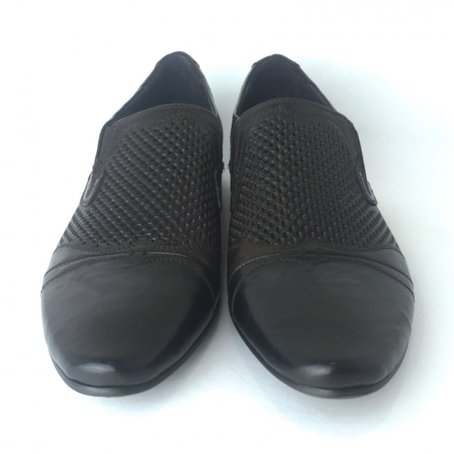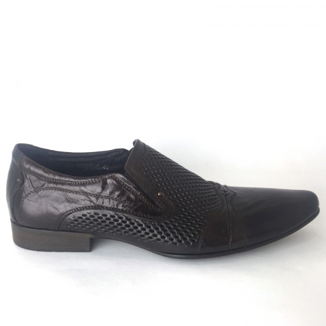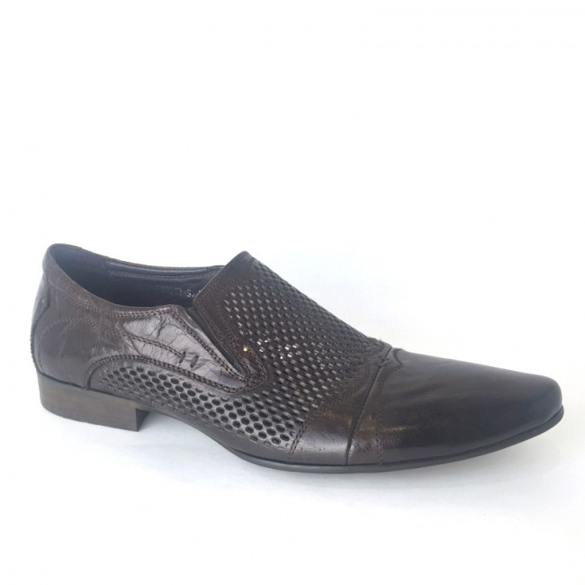 Практичная мужская закрытая модель, дополненная перфорированным узором. Обувь без замка и шнуровки, верхний слой модели изготовлен из натуральной кожи. Эластичные вставки по бокам. Обувь выполнена в коричневом цвете.
