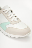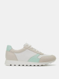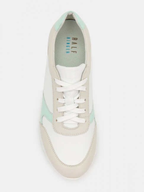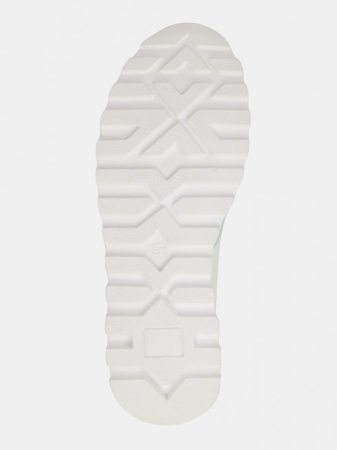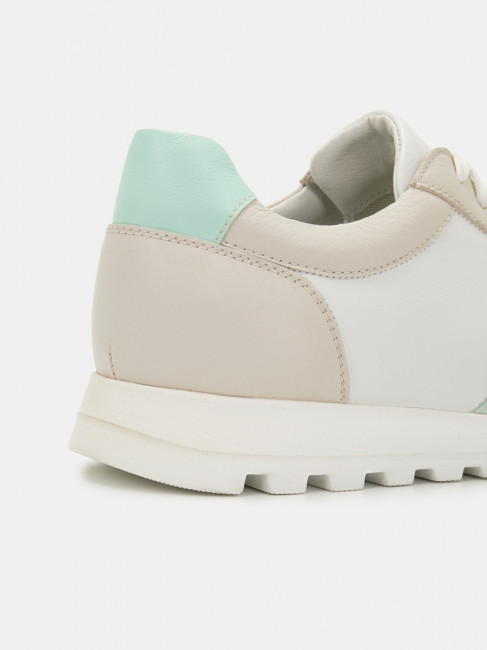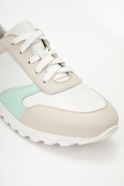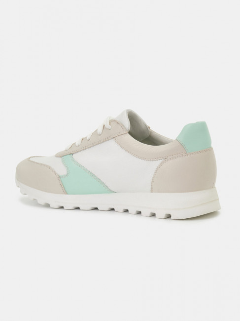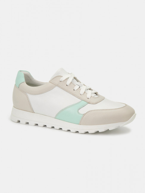 Кроссовки женские WALL белого цвета с бежево-зеленой отделкой. Натуральная кожа верха прочная и надежная, обувь прослужит долго. Подкладки нет, поэтому модель комфортно носить в теплую погоду. Двухслойные стельки созданы специально для активной жизни: верхний слой из полиэстера дышит и отводит влагу, основа из антибактериального материала Polisport смягчает удары при ходьбе, чтобы ноги не уставали. Легкая подошва из полиуретана хорошо амортизирует и устойчива к износу. Оригинальный протектор обеспечивает надежное сцепление с любой поверхностью. Белые кроссовки дополнят повседневные образы с джинсами, брюками и спортивными костюмами.