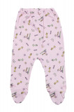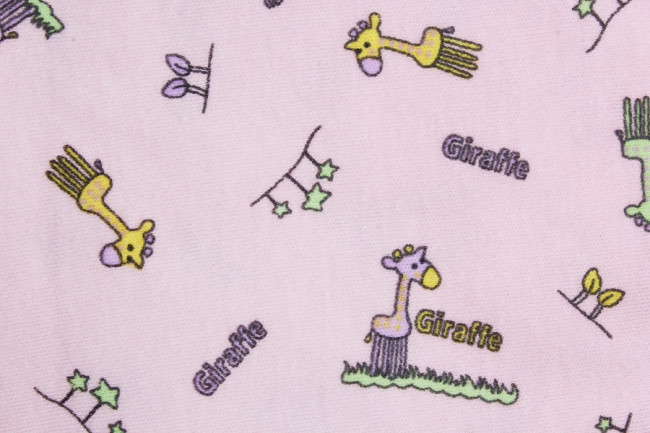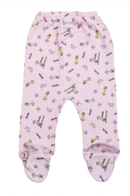 Мягкие классические детские ползунки с закрытыми пятками. Пояс на резинке, в меру свободный. Материал изделия – 100% х/б ткань. Цвет – светло-розовый. По всему изделию рисунок с жирафами желтого и зеленого цвета.