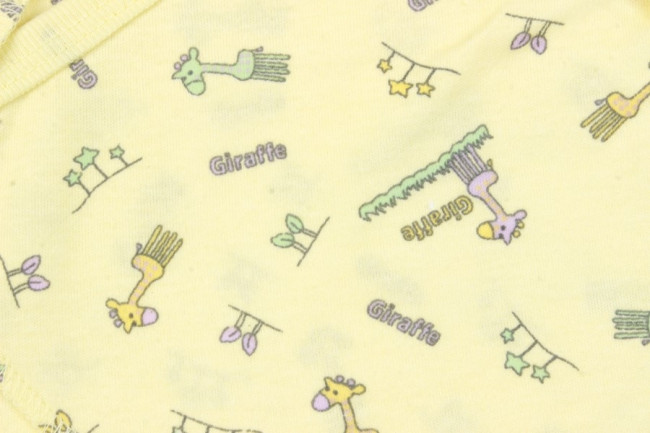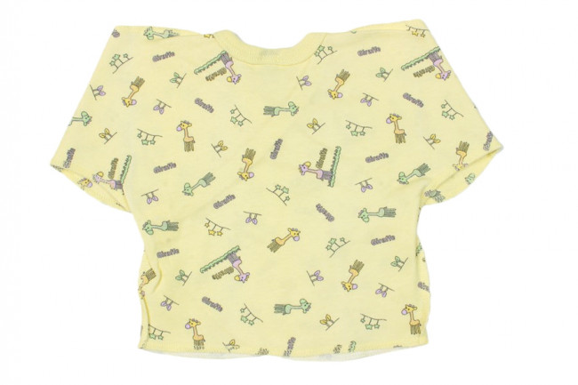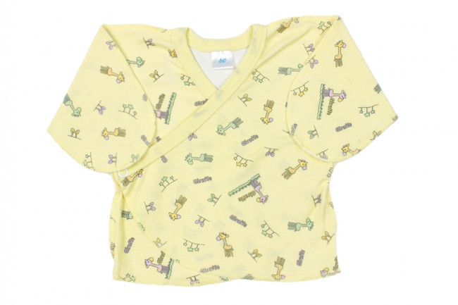 Распашонка хлопчатобумажная для самых маленьких. Крой прямой, свободный, рукава с закрытыми ладошками.Все швы наружние. Застежка боковая. Цвет распашонки желтый, с принтом в виде жирафиков. Отлично подойдет малышам любого пола.