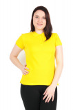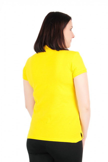 Футболка женская, модель – поло, немного приталенная. Рукава укороченые, прямые. Горловина округлая, с отложным воротником и небольшим разрезом на застежках-пуговицах. Материал изделия – чистый хлопок, разновидность ткани – «пике», с характерной рельефной поверхностью. Цвет изделия – желтый. Принт на футболке отсутствует.