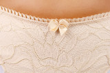 Трусы-стринги с заниженной посадкой на аккуратной резинке, пришитой с внутренней стороны белья. Цвет изделия – бежевый. Спереди декорированы кружевом и атласным бантиком.