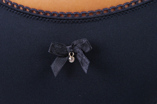Трусы-стринги. Выполнены из нежного эластичного матеала, с гипюровыми вставками по бокам. Цвет- темно/синий. Декорированы трусики маленьким атласным бантиком.
