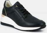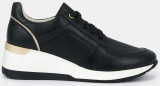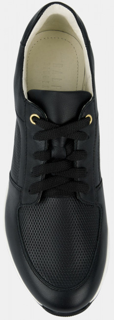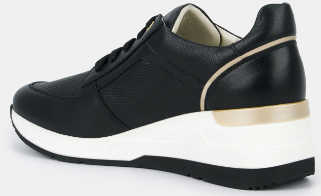 Кроссовки женские RENE черного цвета. Натуральная кожа верха прочная и надежная, обувь прослужит долго. Мягкий верхний край и высокая пятка делают посадку комфортной, шнуровка регулирует плотность прилегания. Подкладки нет, поэтому модель комфортно носить в теплую погоду. Кожаная стелька позволяет ногам дышать. Подошва из двух видов полиуретана с небольшой танкеткой хорошо амортизирует и устойчива к износу. Модель подходит на каждый день, она сочетает в себе спортивные элементы и женственный силуэт. Черные кроссовки дополнят повседневные образы с джинсами, брюками и платьями в стиле casual.