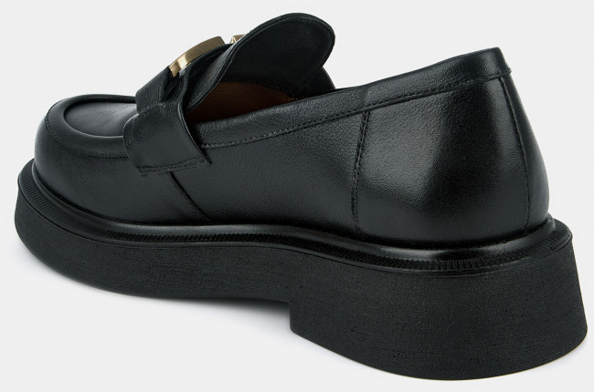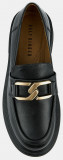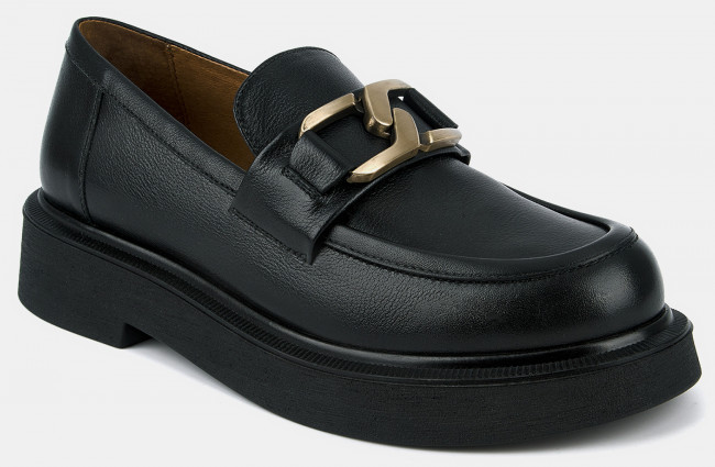 Лоферы женские ANNA черного цвета. Натуральная кожа верха, подкладки и стельки позволяет ногам дышать и поддерживает правильный микроклимат в обуви. Пару украшает крупная стилизованная цепочка бронзового оттенка и декоративный шов на носке. Подошва из полиуретана гибкая и прочная, она хорошо амортизирует и устойчива к износу. Толщина подошвы делает силуэт пары актуальным, такие массивные формы в тренде. Черные лоферы дополнят деловые костюмы, а также джинсы и брюки в стиле casual.