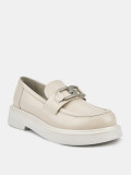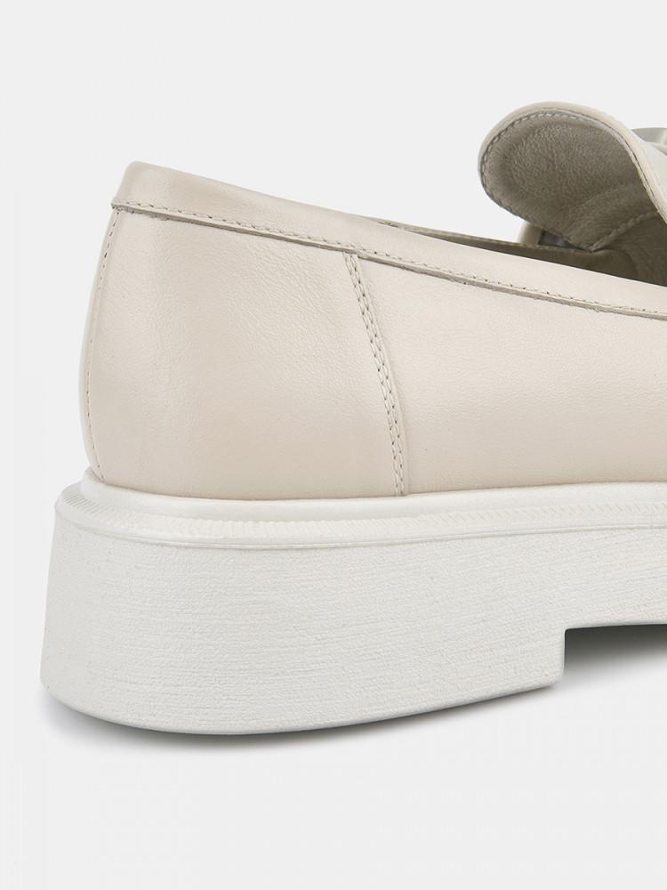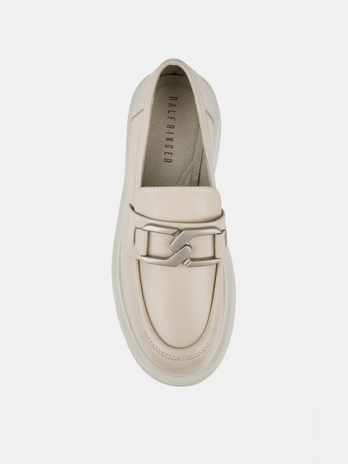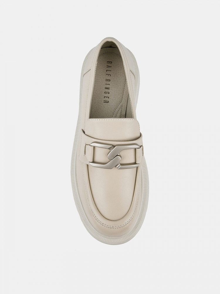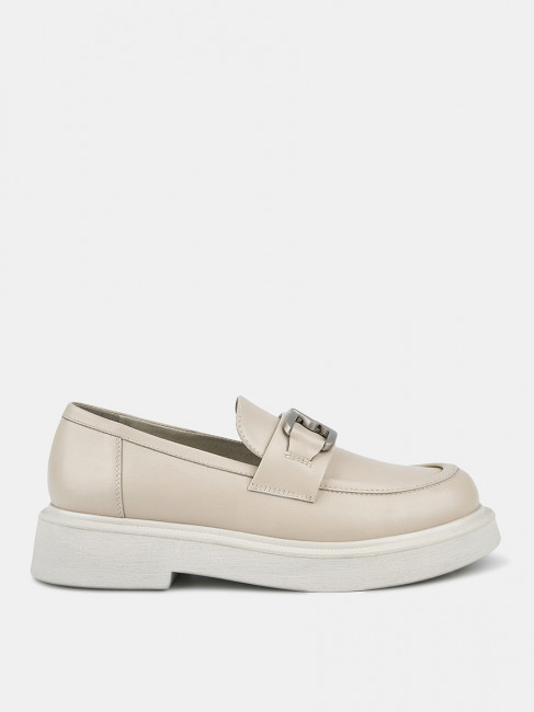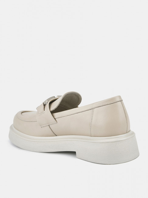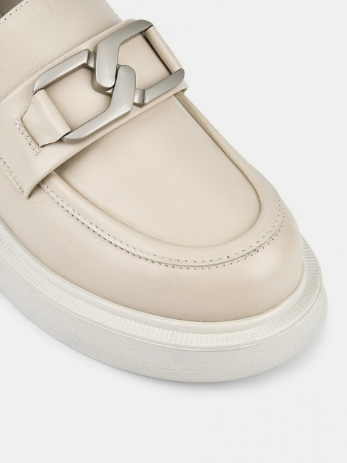 Лоферы женские ANNA светло-бежевого цвета. Натуральная кожа верха, подкладки и стельки позволяет ногам дышать и поддерживает правильный микроклимат в обуви. Пару украшает крупная стилизованная цепочка серебристого оттенка и декоративный шов на носке. Подошва из полиуретана гибкая и прочная, она хорошо амортизирует и устойчива к износу. Толщина подошвы делает силуэт пары актуальным, такие массивные формы в тренде. Бежевые лоферы дополнят деловые костюмы, а также джинсы и брюки в стиле casual.