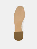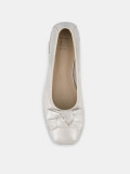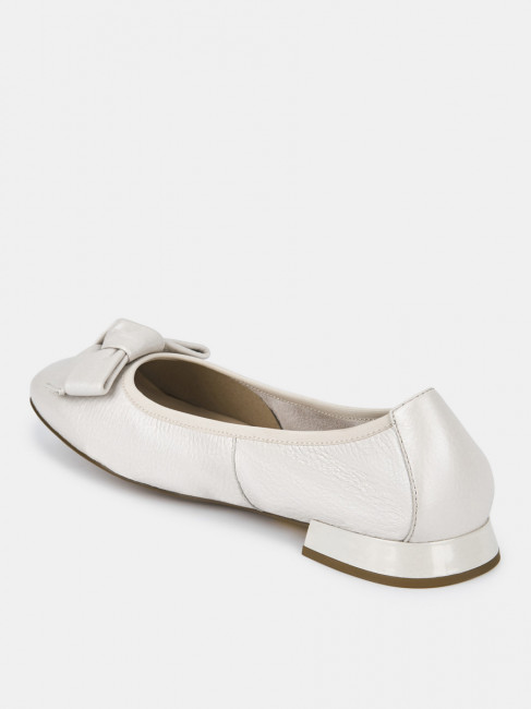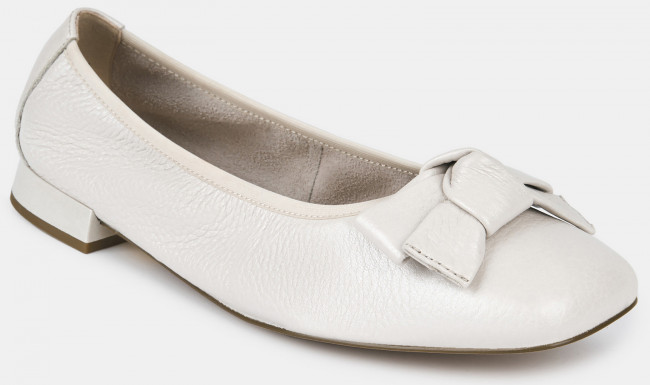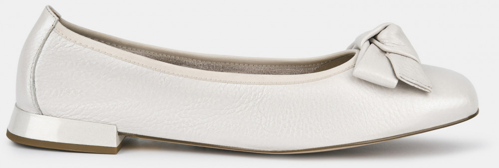 Балетки женские WEST жемчужного цвета на широкую ногу. Верх выполнен из натуральной оленьей кожи, которую отличает мягкость, прочность и эластичность. Выраженный крупнозернистый рисунок делает кожу фактурной и выразительной. Подкладки нет, поэтому балетки прекрасно садятся по ноге. Кожаная стелька дает стопам дышать. Подошва из прочного полимерного материала дополнена небольшим расклешенным каблуком. Глянцевая поверхность каблука подчеркивает фактурность кожи. Квадратная форма носка в тренде, носите белые балетки с джинсами, элегантными брюками и офисными платьями.