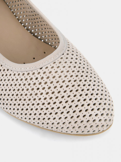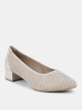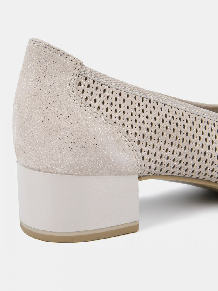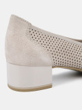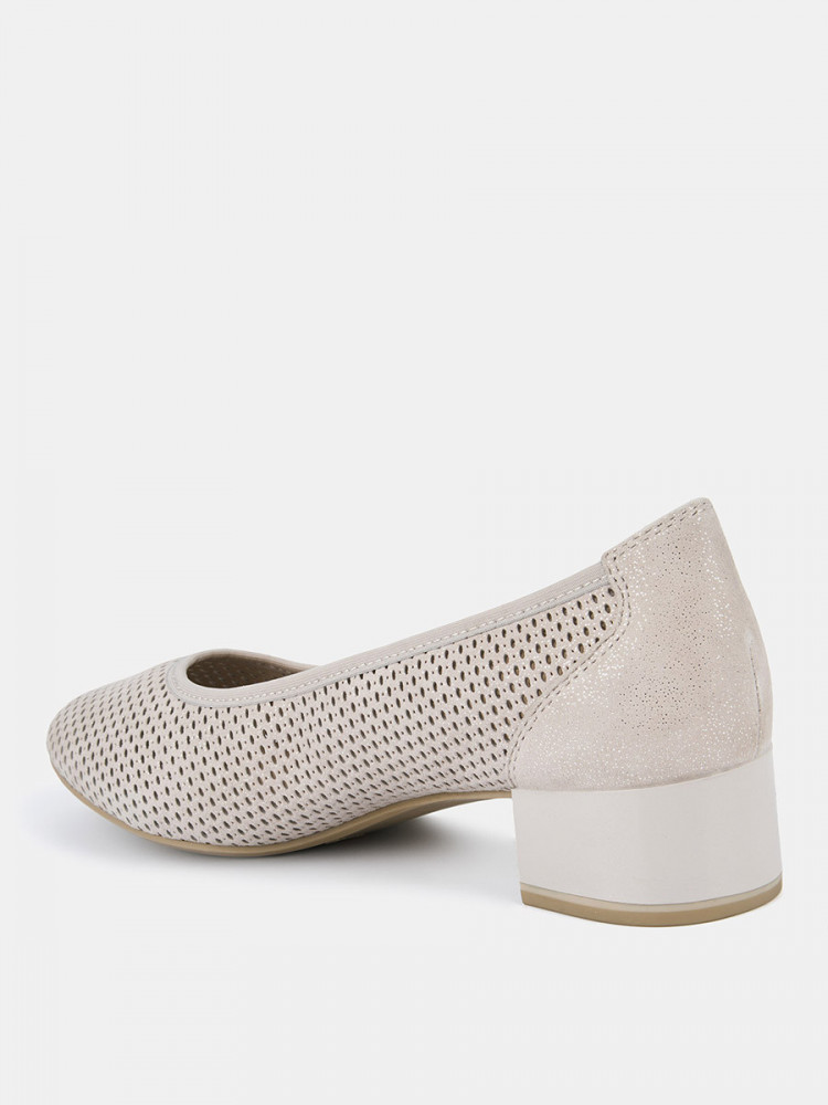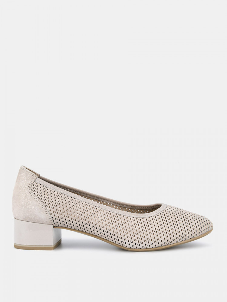 Туфли лодочки женские WEST бежево-серого цвета на широкую ногу. Мерцающее напыление придает модели мягкий блеск. Верх и стелька из натуральной кожи позволяют ногам дышать. Сквозные отверстия перфорации также свободно пропускают воздух, поэтому туфли подойдут для жарких дней. Широкий устойчивый каблук высотой 4 см идеален на каждый день. Подошва из полимерного материала прочная и износостойкая. Серые лодочки дополнят элегантные платья и брюки для работы, а также женственные образы с джинсами на каждый день.