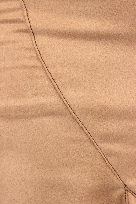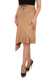 Женская облегающая фигуру юбка длиной до колена. Плотность ткани средняя. Цвет –  светло/коричневый, принт отсутствует. Вверху на поясе есть завязка. Низ юбки также неровный.