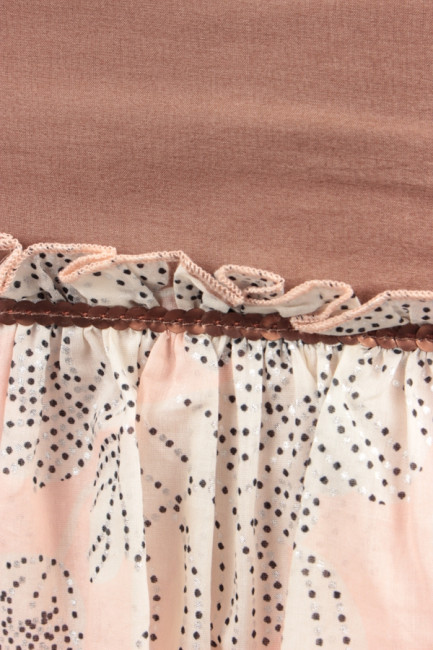 Нарядная женская юбка длиной выше колена. Посадка стандартная, крой облегающий. Цвет – светло-коричневый, с аппликациями в виде светлых цветов. Низ отделан воздушным светло-розовым рюшем с принтом черного и серебристого цвета. Место крепления рюша к юбке украшено коричневыми пайетками.